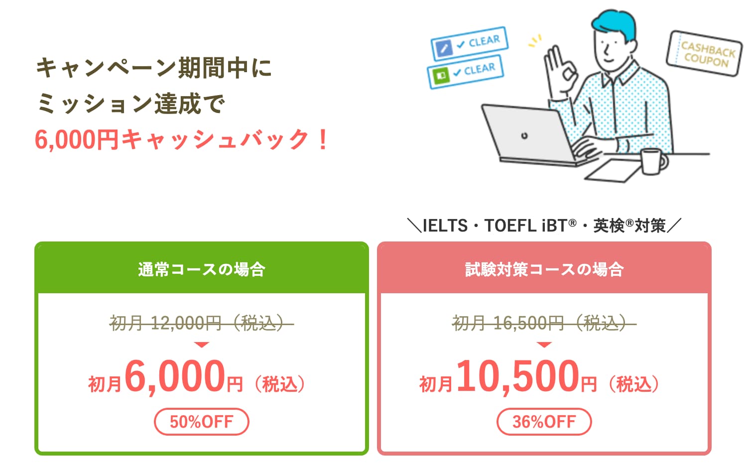 直近の月額受講料(1ヶ月分)から6,000円がキャッシュバックされるクーポンコード■特典受取条件
