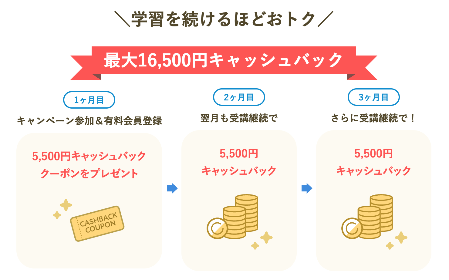 さらに、2ヶ月目、3ヶ月目も受講を継続いただいた方には、各月の受講料からそれぞれ5,500円をキャッシュバック。すべての条件を達成いただくと、クーポンとあわせて合計最大16,500円のキャッシュバックを受けることができます。
