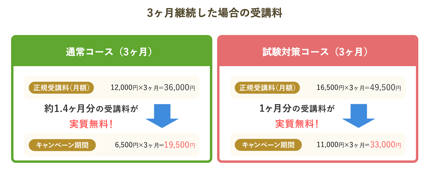 IELTSやTOEFL iBT®、英検®など各資格試験対策コースでは、実質「1ヶ月分」が、通常コースなら実質「約1.4ヶ月分」が無料で受講でき、おトクに学習を進められます。