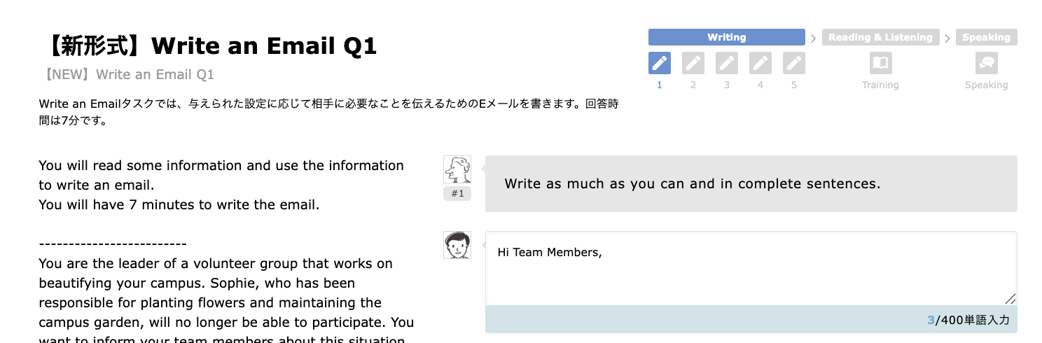 TOEFL iBT®対策コースのリニューアルでは、新形式問題の中でも特に独学では対策が難しい”Write an Email”(12問)と”Take an Interview”(12問)の2種類の問題を新規に作成しました。また、"Write for an Academic Discussion"では出題形式自体に変更はありませんが、問題文を新形式の傾向に合わせて更新しています。既存問題も継続提供しますので、アップデート前に受験予定の方も、引き続き学習いただけます。